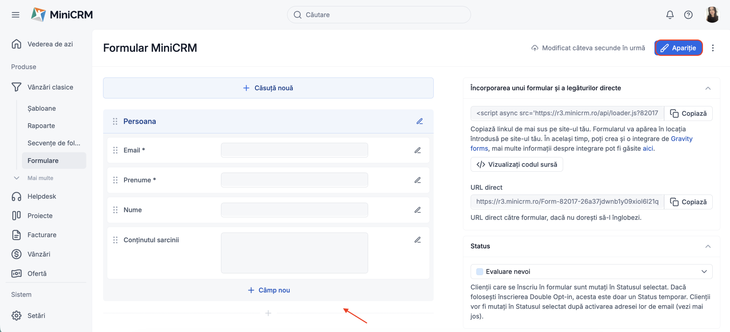 Pentru a vizualiza efectiv modul în care este afișat formularul, este nevoie să apeși butonul Apariție.