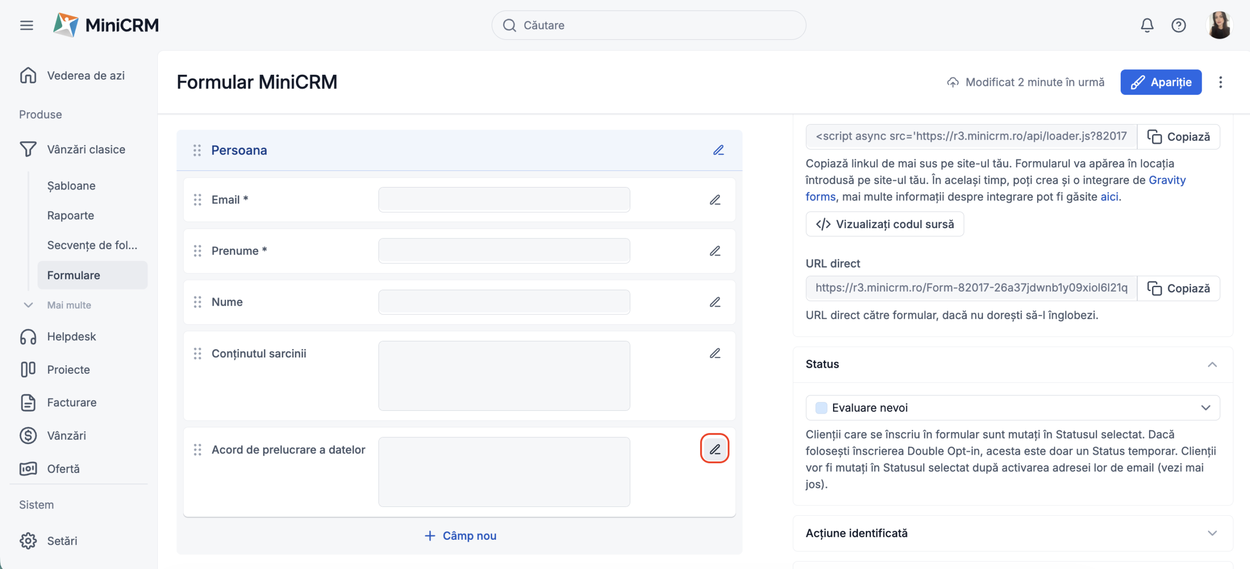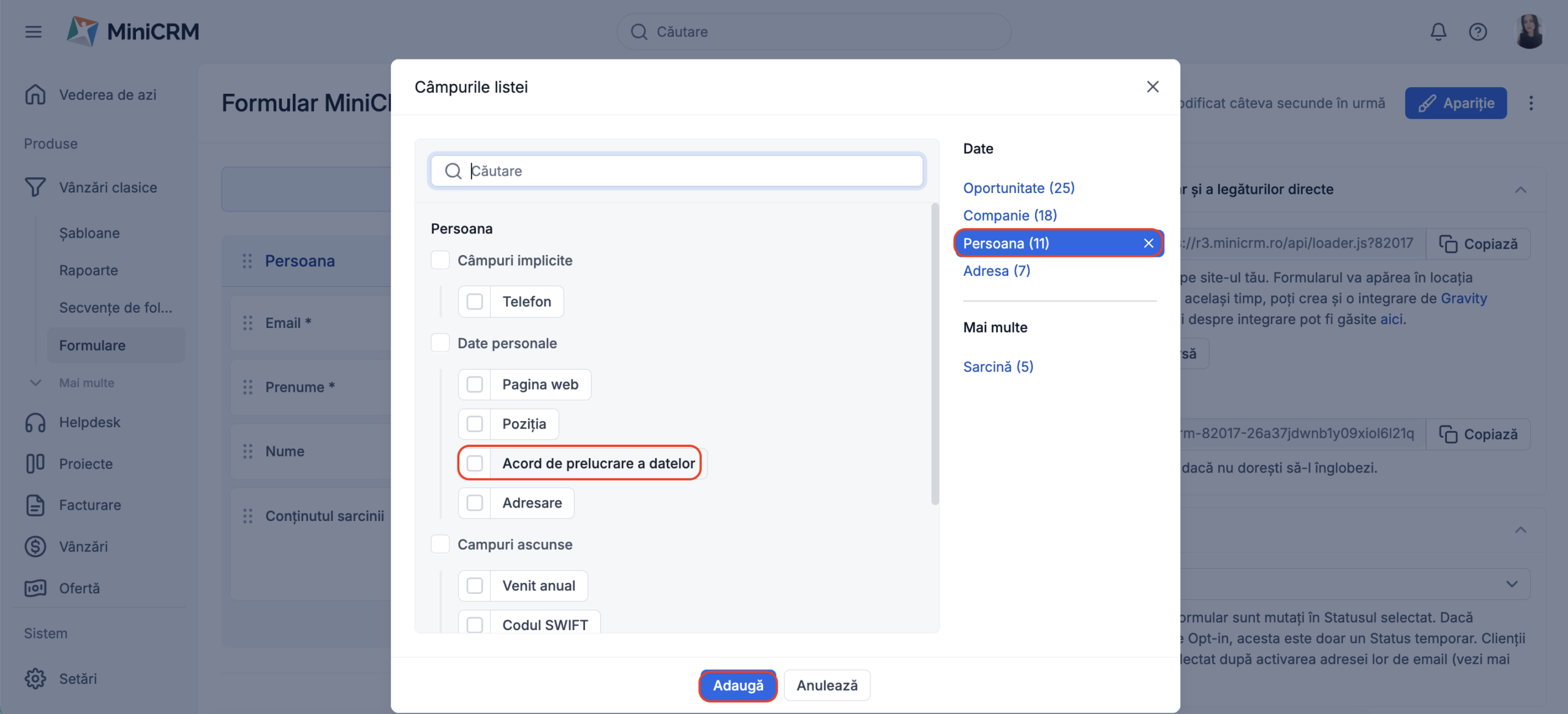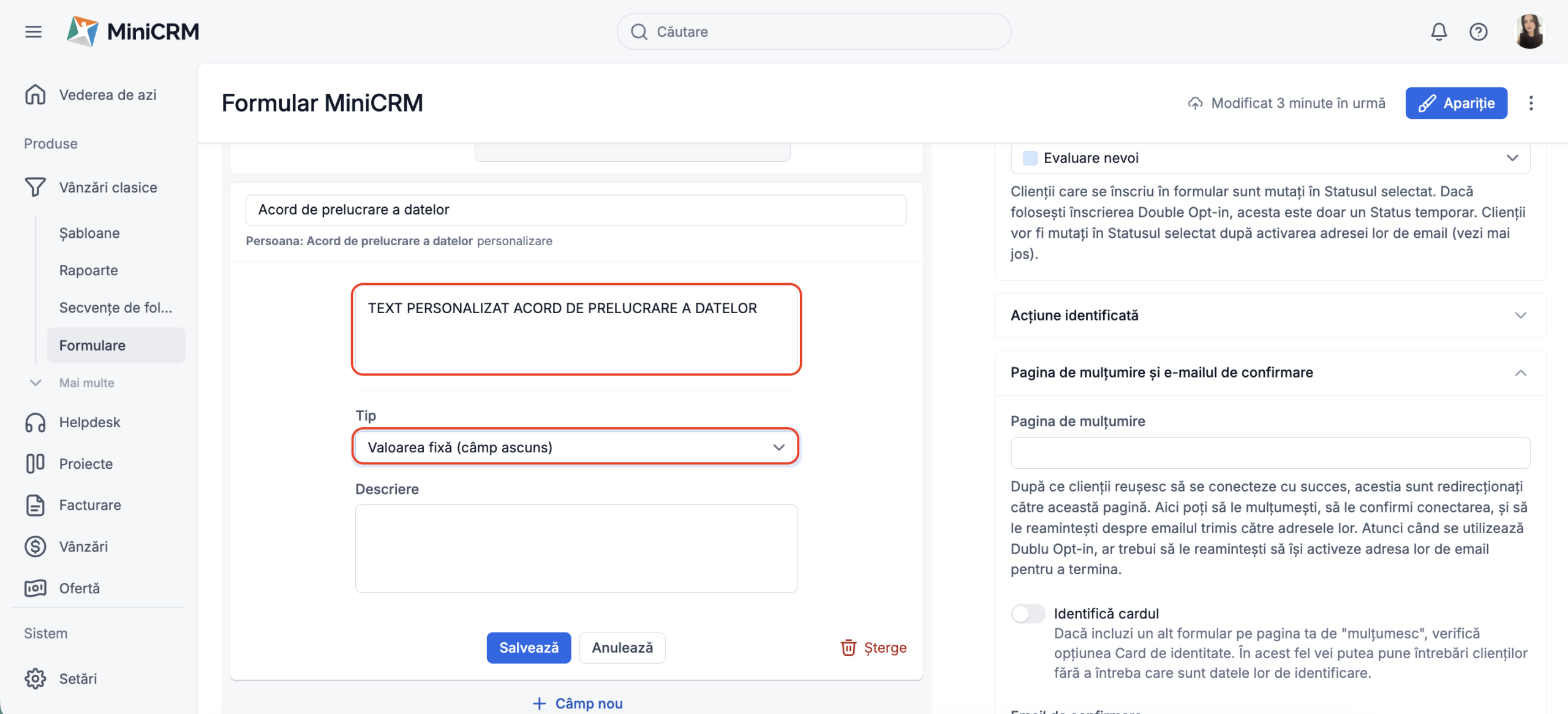 Această funcționalitate va fi activată în mod implicit pentru majoritatea utilizatorilor MiniCRM iar bifa va apărea în mod automat pe formularele tale.