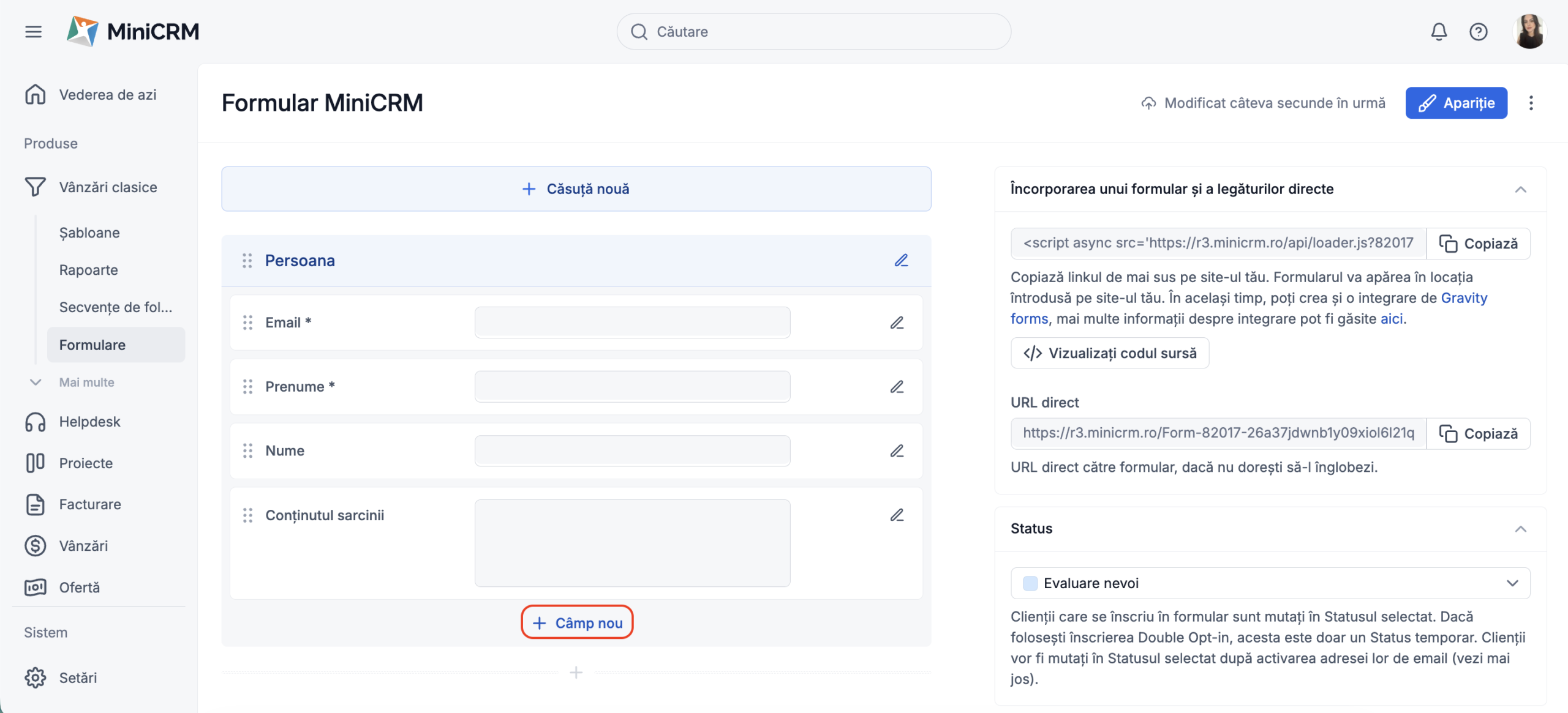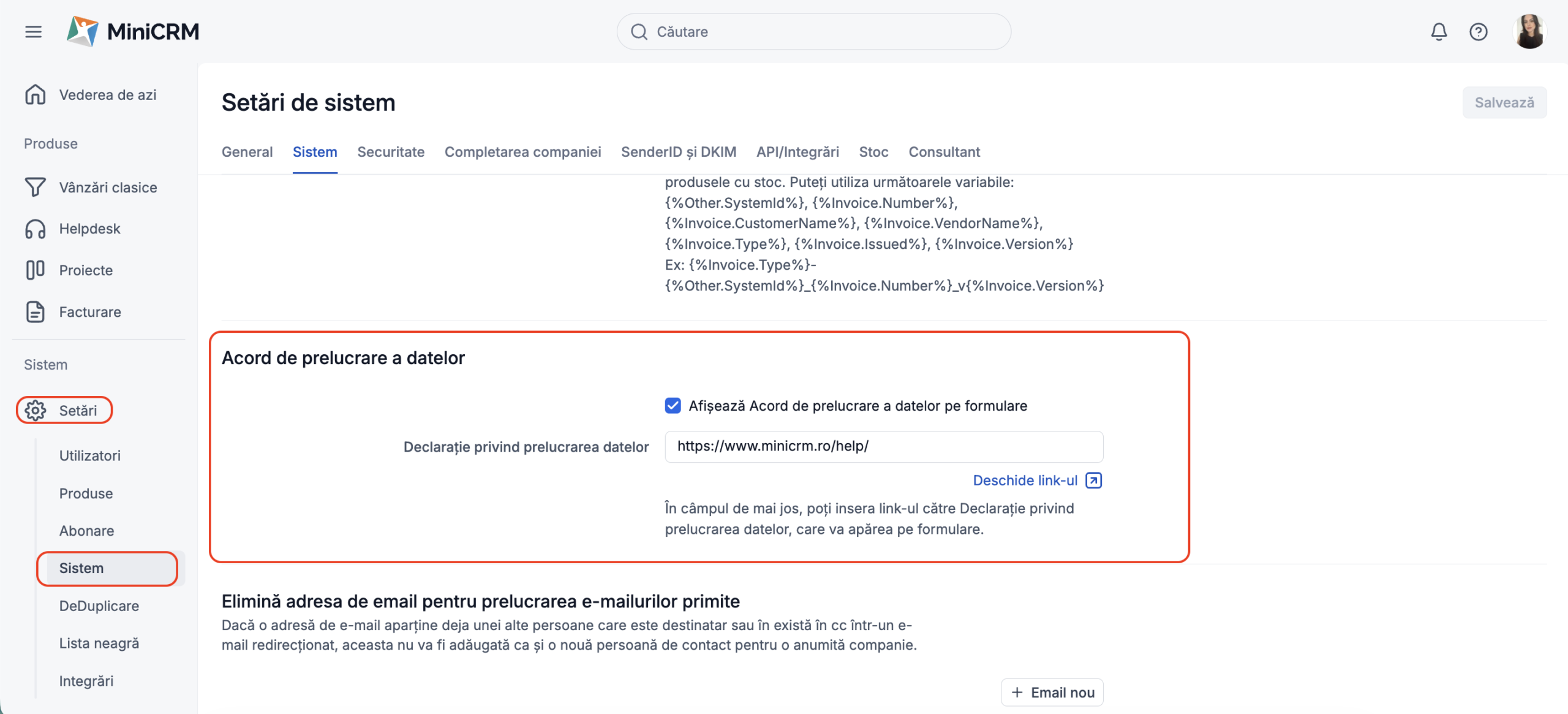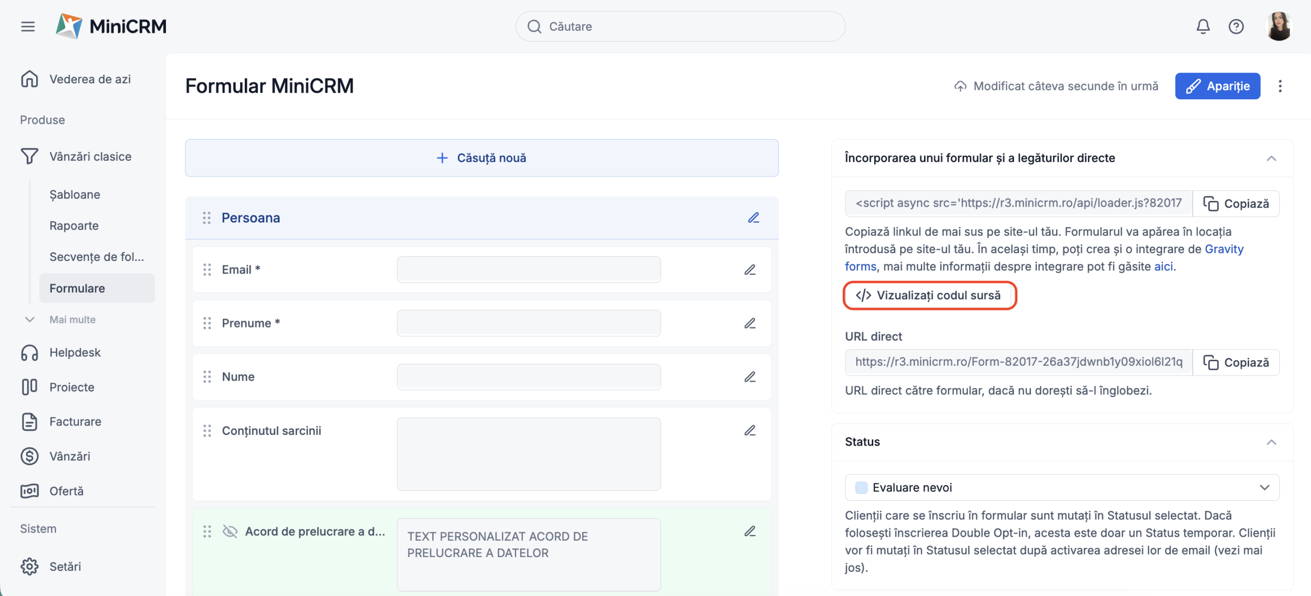 Această funcționalitate va fi activată în mod implicit pentru majoritatea utilizatorilor MiniCRM iar bifa va apărea în mod automat pe formularele tale.