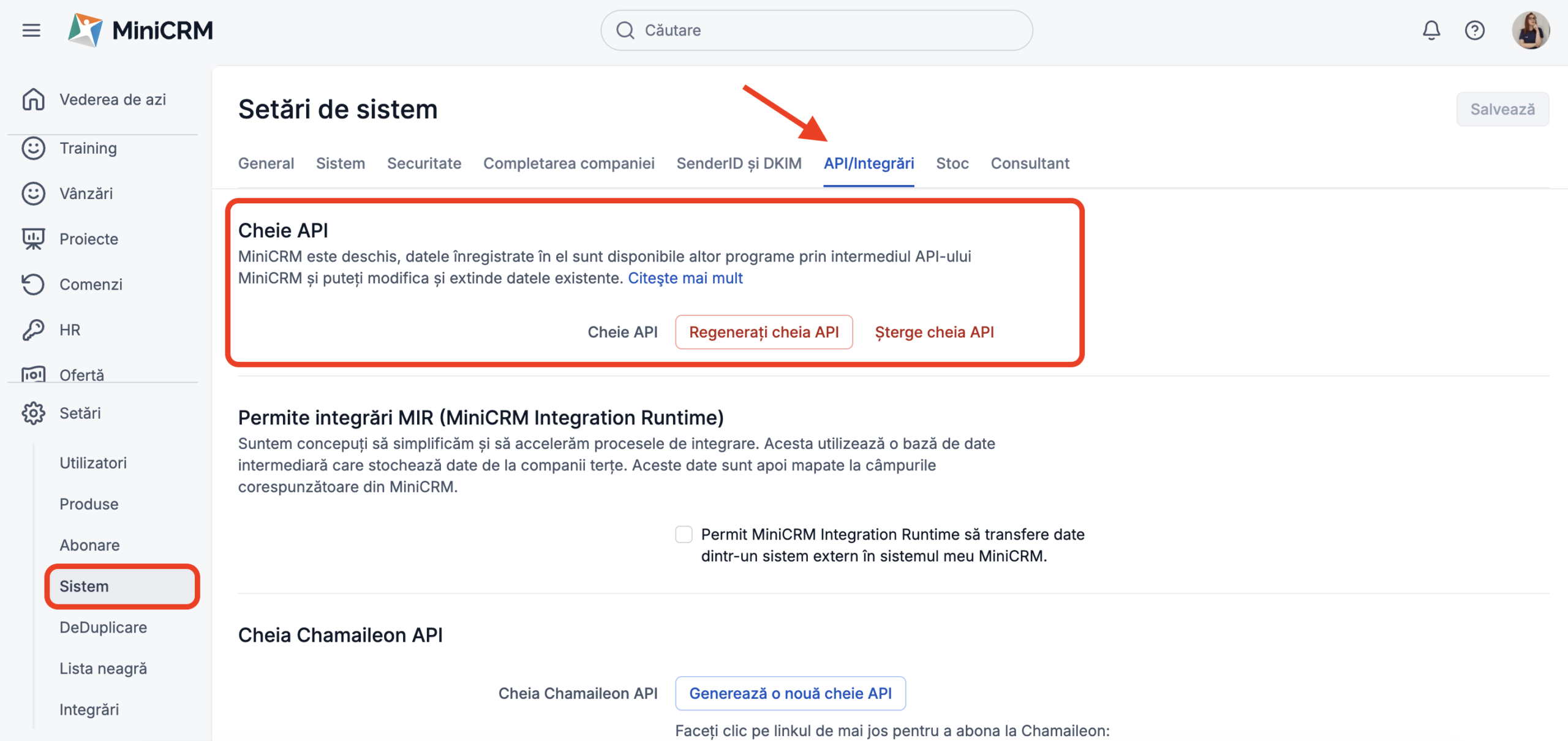 Pasul 1: Din MiniCRM, intră în setările sistemului tău. Selectează sub-meniul de Setări, și selectează tab-ul API/Integrări. De aici, generează o cheie API – dar ai grijă! Dacă ai deja o cheie API legată în altă parte, aceasta se va suprascrie și va trebui să înlocuiești vechea cheie API cu cea nou generată acolo unde ai creat legătura.