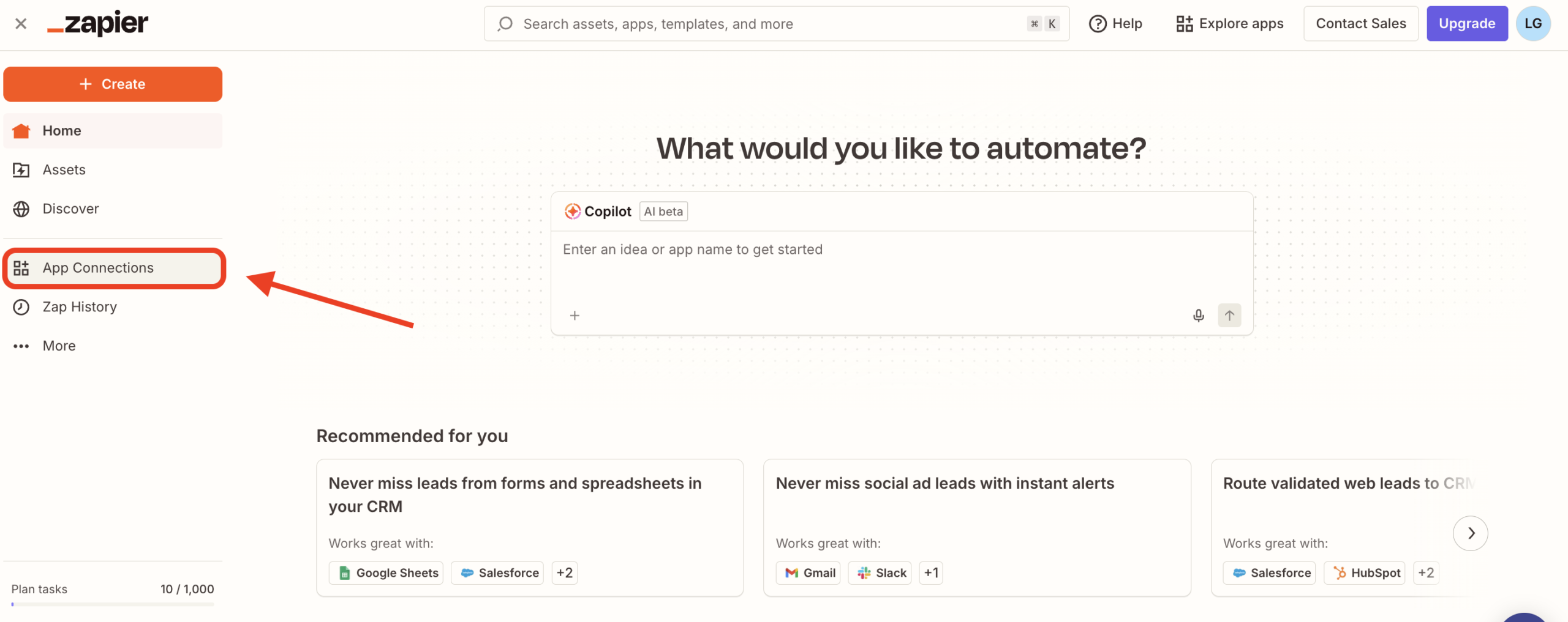 Pasul 2: Odată logat în platforma Zapier, îndreaptă-ți atenția către bara de meniu din stânga, unde vei găsi sub-meniul App Connections.