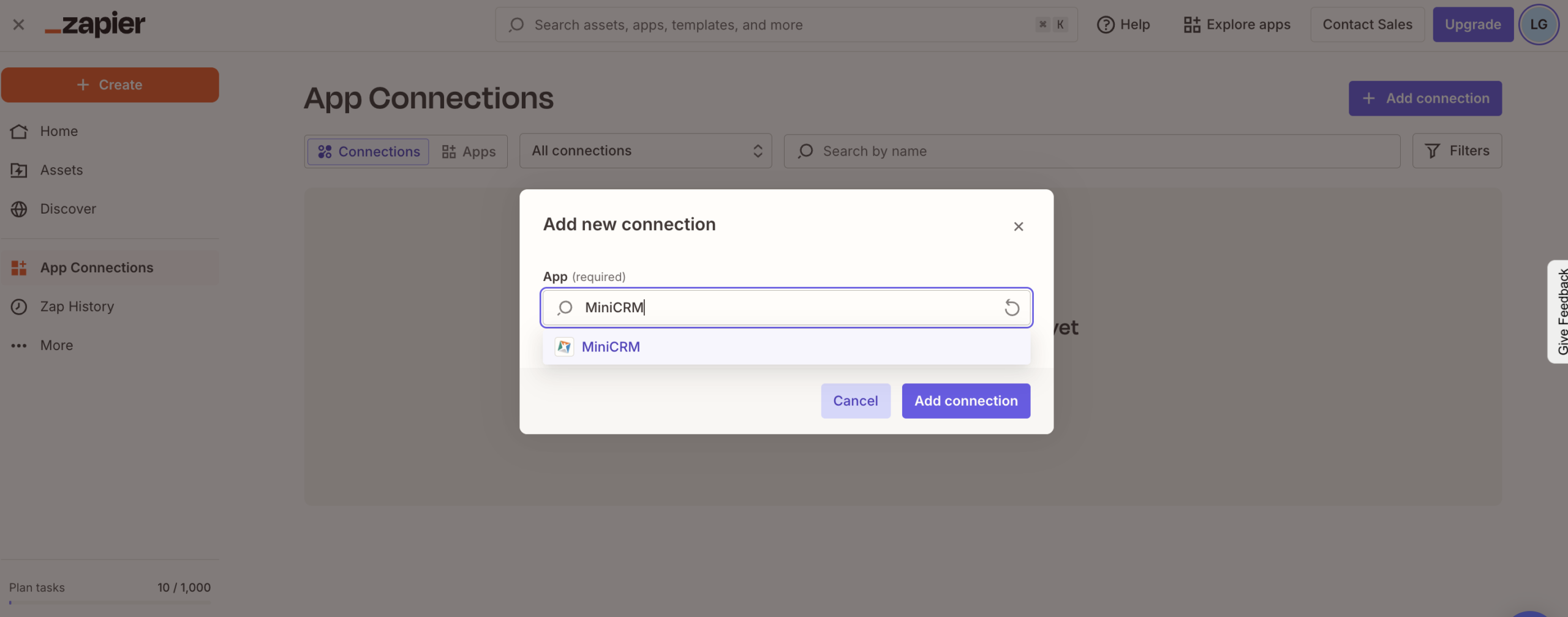 Pasul 3: Click pe butonul +Add connection. Mai apoi, în noul ecran apărut, caută din tastatură MiniCRM. La final, click pe Add connection.