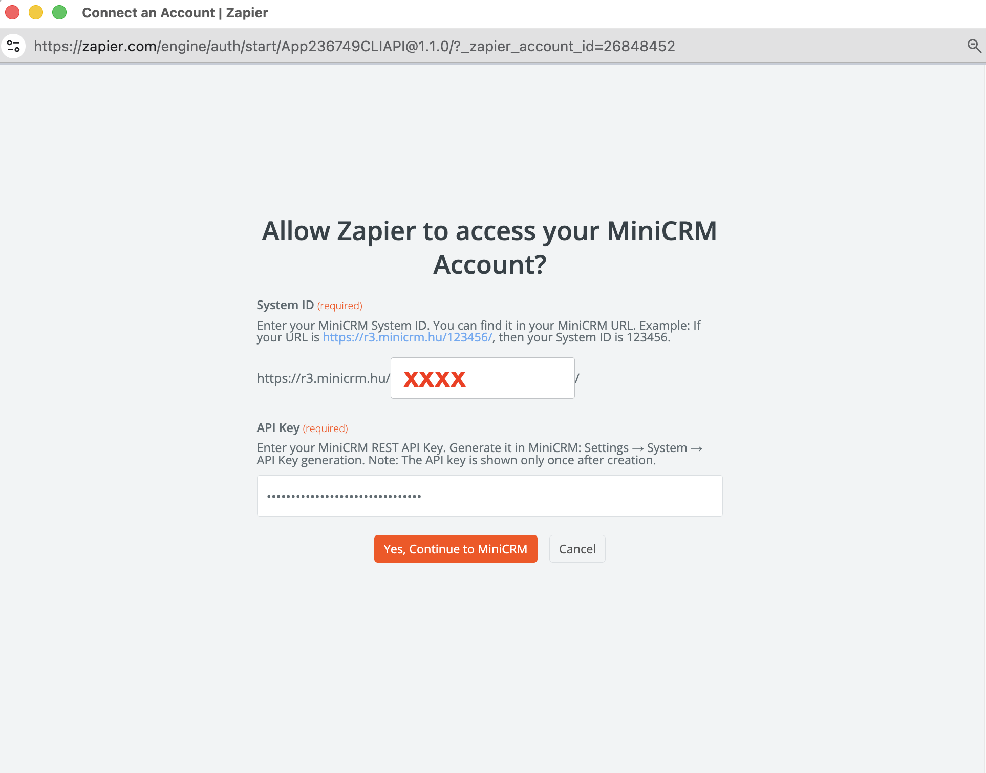 - Autentificarea MiniCRM în Zapier se poate realiza doar printr-o cheie API