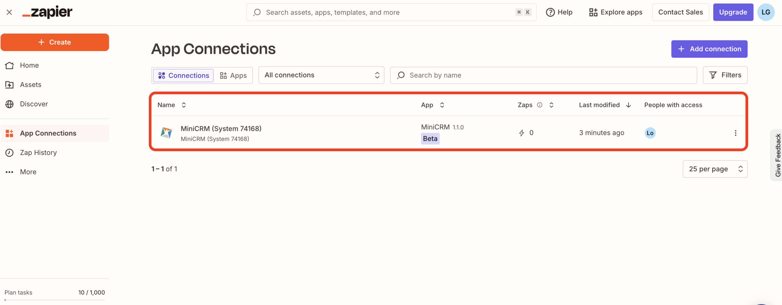 Pasul 5: Dacă e totul în regulă, MiniCRM ar trebui să-ți apară acum în lista ta de conexiuni.