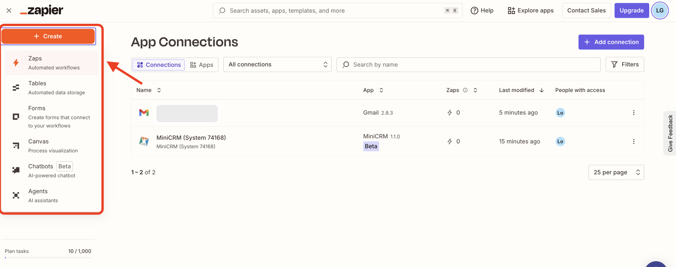 Pasul 1: Odată ce ai adăugat conexiunea de interes pe lângă cea cu MiniCRM (pe modelul de mai sus), îndreaptă-ți atenția către butonul portocaliu din stânga sus, +Create. De aici, alege opțiunea Zaps.