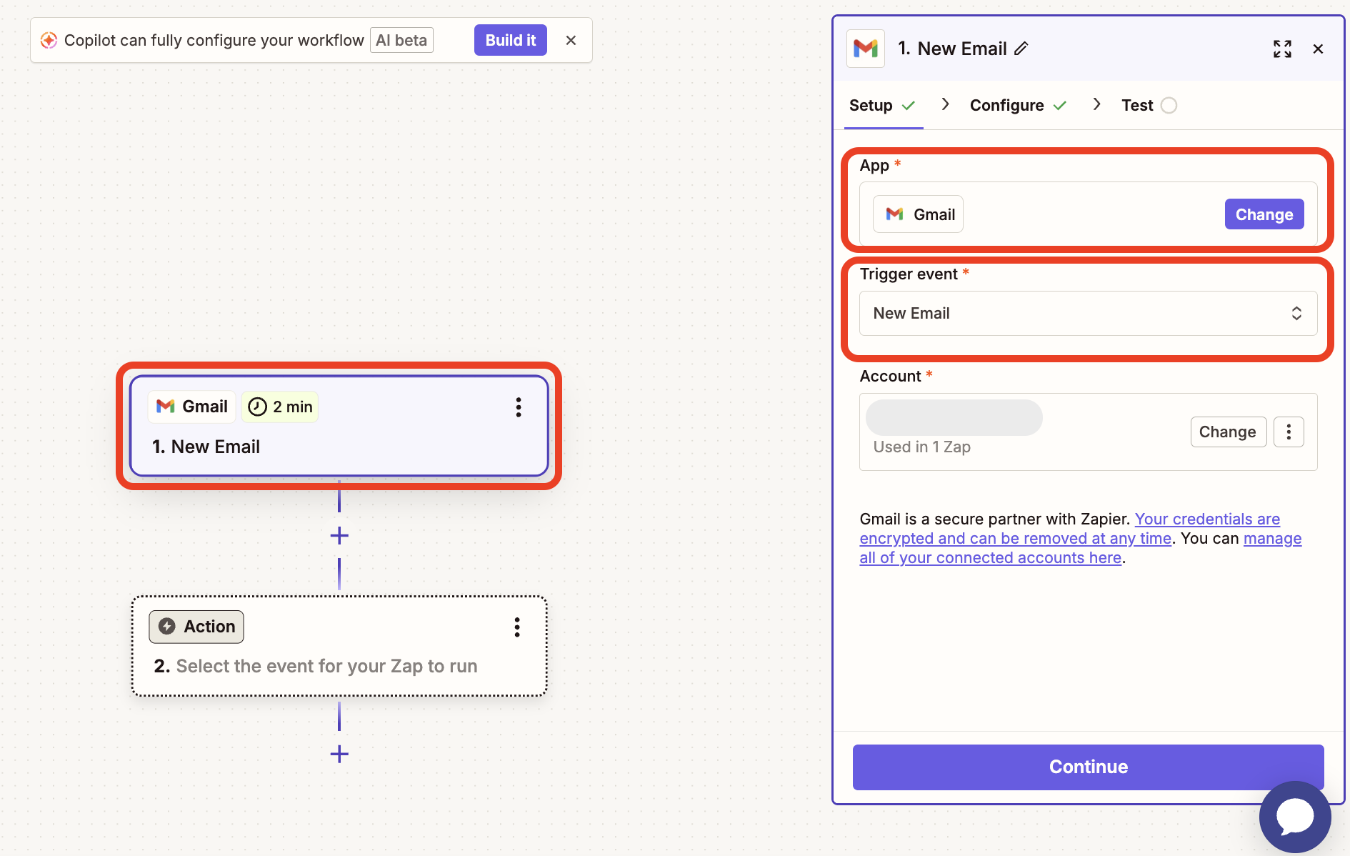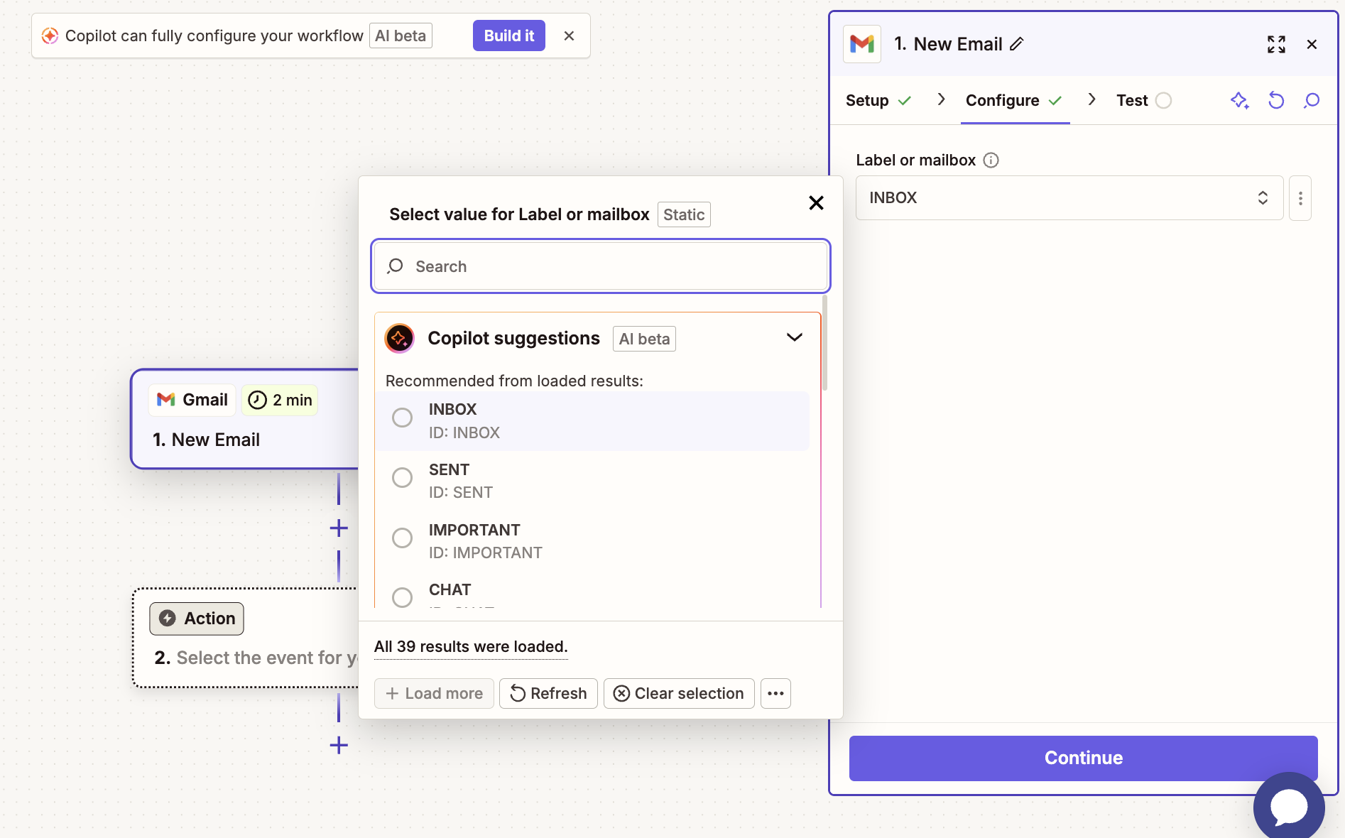 Pasul 4: În eventualitatea în care ai doar un anumit folder specific din Gmail din care vrei ca elementul declanșator să se pornească, îl vei putea selecta din zona de Configure. Alternativ, poți lăsa câmpul necompletat pentru o sincronizare globală. La final, apasă pe butonul Continue.