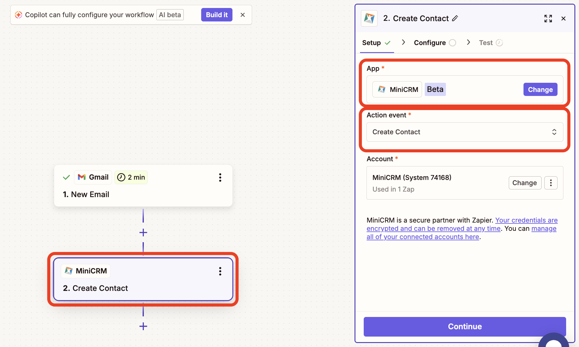 Pasul 5: Odată ce trigger-ul a trecut prin faza de testare cu succes, vei fi redirecționat automat către crearea celui de-al doilea pas al automatizării, anume acțiunea rezultată. În acest sens, noi vom dori crearea unui card nou în MiniCRM. Așadar, alege MiniCRM ca și platformă pentru pasul doi. Apoi, în câmpul de Action event, selectează valoarea de Create Contact sau Create Card, după preferință. Apoi, click pe Continue.