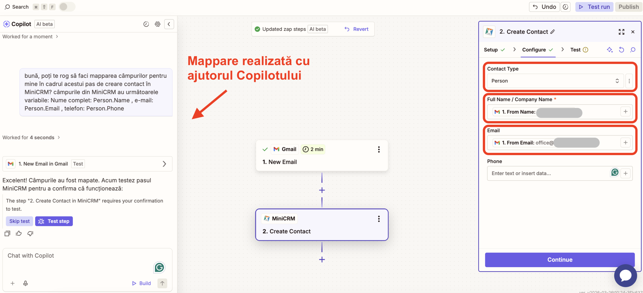 Pasul 6: În zona de configurare a acestui pas, vei mai avea și de mappat câmpurile aferente, în care și din care informația să fie transmisă. Dacă nu te descurci în acest sens, te încurajăm să folosești asistentul AI Copilot oferit de Zapier.