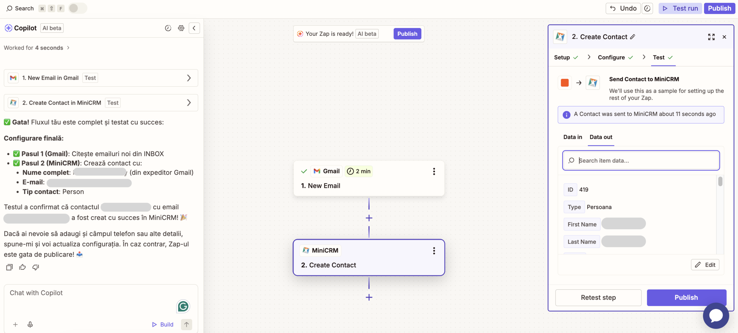 Pasul 7: După ce ai făcut toate setările de mai sus, ultimul pas va fi să testezi automatizarea. În acest exemplu, Zapier a preluat un e-mail din adresa de Gmail, și a trimis datele aferente către sistemul de MiniCRM conectat. Ca să te asiguri că e totul în regulă, poți face și tu un test manual ulterior. Când e totul gata, click pe butonul Publish.